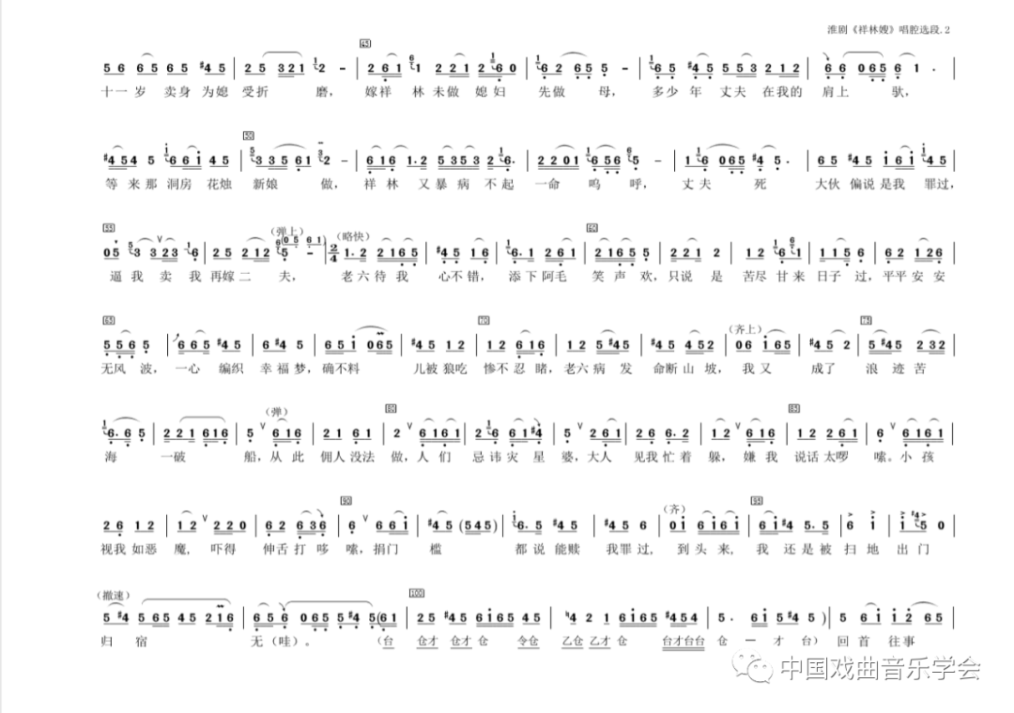是可以在第三小节抢换气的。这样,演员便能从容地一气呵成地唱完这段颇具传统特色的淮剧垛板,以达到强烈的戏剧效果。