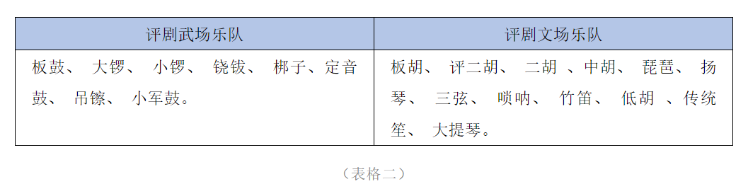 上世纪50年代,评剧现代戏得到了空前的发展,涌现了一批精品剧目,如《刘巧儿》《杨三姐告状》《金沙江畔》《夺印》《向阳商店》等等。评剧乐队为了适应现代戏的发展,扩大乐队规模,在原来乐队编制基础上又加入了民族乐器。下面是上世纪50年代左右的乐队编制。见表格一