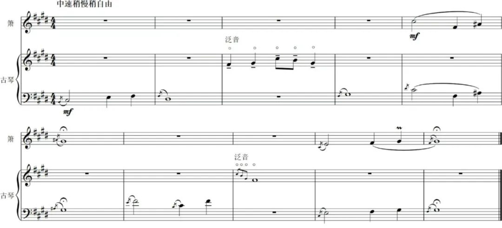 紧接序幕的是一个颇具有回忆性的衬乐,晚年的班昭回想自己的二位师兄,两人在衬乐的伴奏中分别亮相出场。在这里我沿用了主题中前三个音符构成的动机,继续运用了五声音阶模进的手法来强化主题给人带来的印象感觉,并采用古琴与箫的二重奏,在中慢速的演奏中,充分运用古琴的滑音、抹音、泛音等技巧来营造出回忆性、清澈感、诉说感很强烈的一种气氛。这即是之前提到过的主题的贯穿与变化运用的体现。