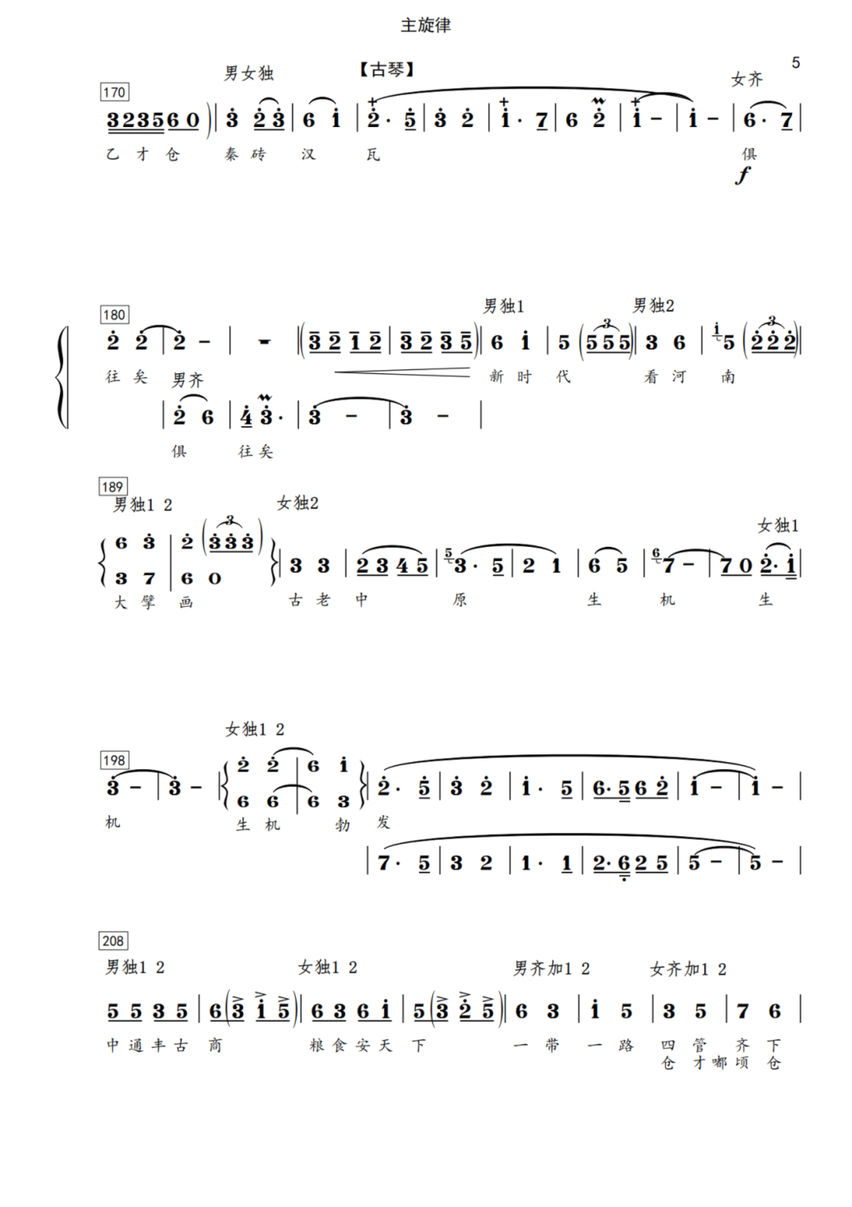 全曲运用无伴奏合唱开篇,赋以富有动力的音乐张扬推动,并用重唱的合唱,对“天下之中,巍巍华夏,宅兹中国,中原老家”给予了浓笔众彩强化和渲染。而后,贾文龙自豪的咏叹出:三皇五帝在此住,诸子百家似云霞;李树建纯正地道的豫西调庄重的描绘出:夏商周皆出河洛、汉唐宋一路繁华;王惠教授大气磅礴的挥毫出:仰韶彩陶闪耀着文明之光;豫剧表演艺术家杨红霞典雅悠扬的述说出:安阳甲骨镌刻着人类文雅。四书五经、唐诗宋词,春秋文化、秦砖汉瓦。字斟腔酌,词曲辉映!豪迈庄严,辉煌腾达!令人叹服折腰!中通古商,粮食居安。一带一路、四海通达!大别山、红旗渠、焦裕禄精神令人神往!生生不息,继往开来的中原儿女,必将创造宏伟巨业。出彩的中原,为祖国锦上添花!全曲庄严豪迈,流畅自然。编钟古琴的洪钟大吕,曲胡和钢琴的中西对话,春潮涌动的间奏催人奋进!交响和合唱的衔接周密严谨。旋律中的自然转调、节奏和击乐的强弱冲撞和比对,洋溢着词曲作者澎湃的创作激情!脍炙人口的中原音韵,在艺术家的精彩演唱中挥发的精密有致。中原出彩,绚丽中华!